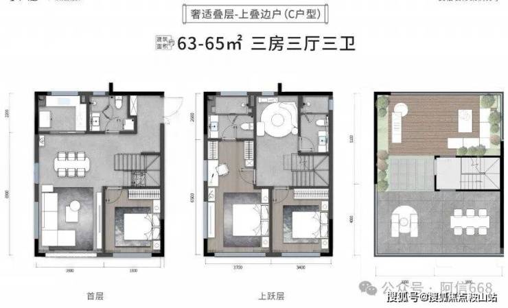 2、中叠边户,63-65平米三房两卫,地上三四层