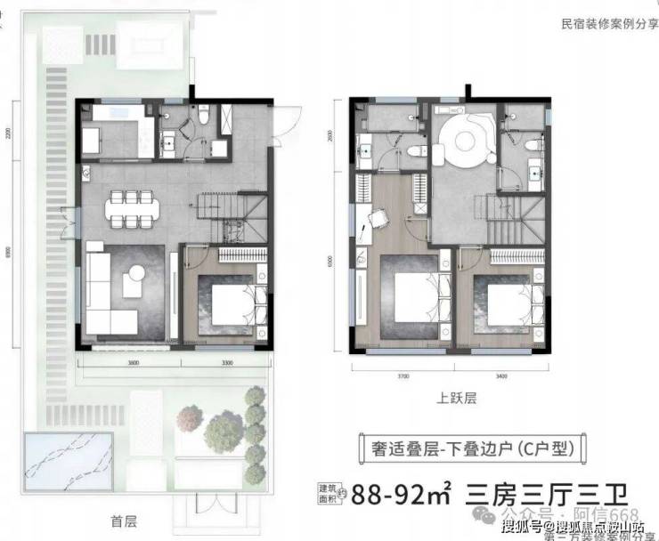 1、边户下叠,88-92平米三房两卫,地上一二层