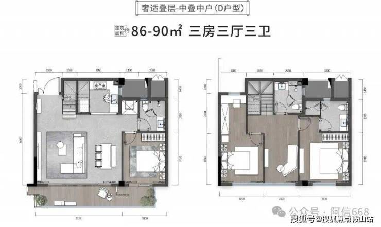 4、下叠中户,86-90平米三房两卫,地上一二层