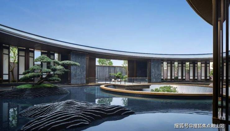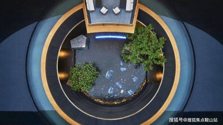 沿环廊而下,飞瀑下沉的空间为“三进”中式高定会所,大尺度环形幕墙,将室内空间与自然无界链接。