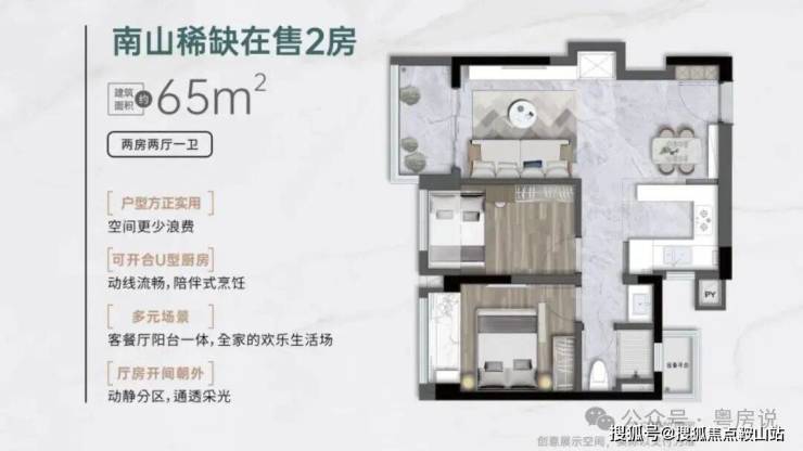 竖厅格局,客厅2.95米开间,LDKB一体化,S墙预留冰箱卡槽位,动静分区,U型厨房,卫生间三段式干湿分离还带1个设备平台,得房率约91%(包含赠送),实用面积约59.15㎡,正东、正西或正南朝向,得房率88%。