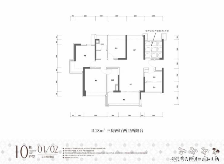 10栋01/02户型,建面约118㎡,原始结构是三房两厅两卫两阳台或三阳台,奇数层是客厅和厨房配有阳台,偶数层是餐厅、主卧和厨房都配有阳台,奇数偶数层入户玄关处都有一块镂空,搭板可以多一个卧室,不能搭的话整体户型结构、功能间配比及分布也还是合理的。