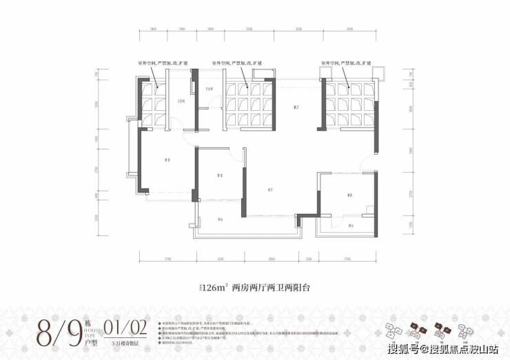 8/9栋01/02户,建面约126㎡,原始结构是两房两厅两卫两阳台或三阳台,奇数层客厅、厨房配有阳台,偶数层是餐厅、主卧,厨房都配有阳台。原始外形轮廓看着还行,但内部镂空位置比较多,搭起来至少可以多两个卧室,不能搭的话就一无是处了!
