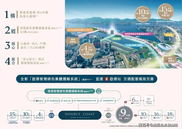 交通方面:预计明年落成的中九龙干线,由启德通往西九龙高铁站预期只需8分钟。项目邻近启德公众码头,现时提供周六、日及公众假期来往北角码头至观塘码头的渡轮服务