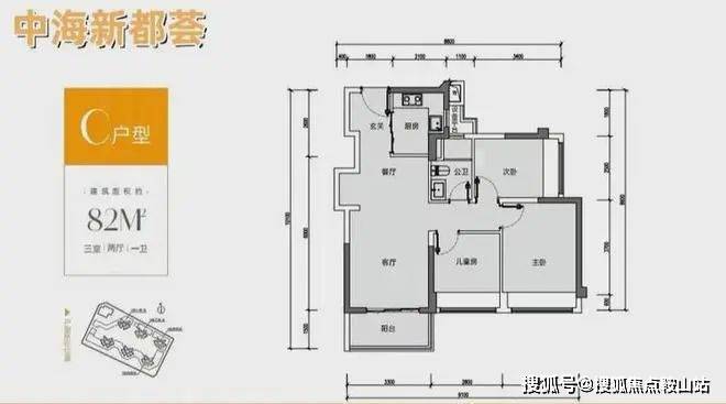 82㎡的3房2厅1卫,设计的是竖厅格局,客厅3.3米开间,S墙体设计预留双开门冰箱位,动静分区,三开间朝南,3个卧室宽度分别为3/2.8/2.5米,得房率:88.87-90.61%(包含赠送),L型厨房,阳台进深1.5米,朝西南或东南向。