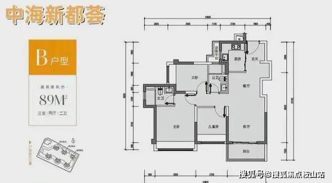 89㎡的3房2厅2卫,设计的是竖厅格局,客厅3.3米开间,S墙体设计预留双开门冰箱位,动静分区,三开间朝南,L型厨房,3个卧室的宽度分别为3.5/2.7/2.5米,得房率87.96-89.68%(包含赠送),阳台进深1.5米,朝西南或东南向。
