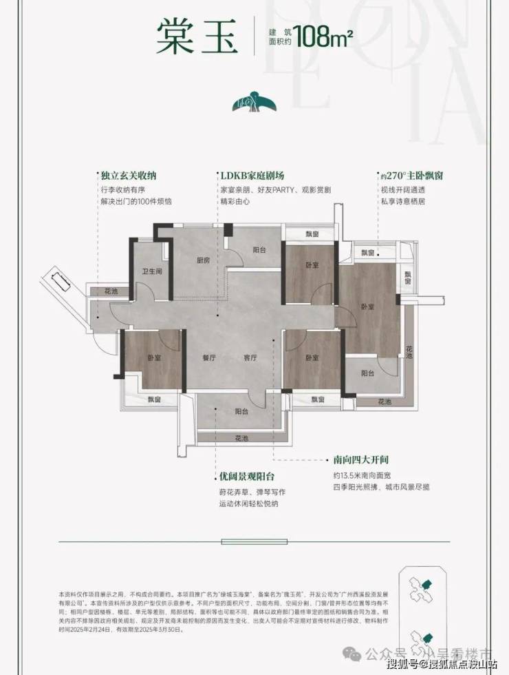 建面105平户型,项目放在了东南单边位,而且是南北对流设计,保证了采光通风,在市场同面积段产品里比较少见,所有房间都有花池、飘窗赠送,空间感应该不小,像主卧还能放下衣帽间,估计整个户型实际能去到120㎡左右,进门处带了入户花园,可以用来收纳之余,也多了一份仪式感,总价400万起。