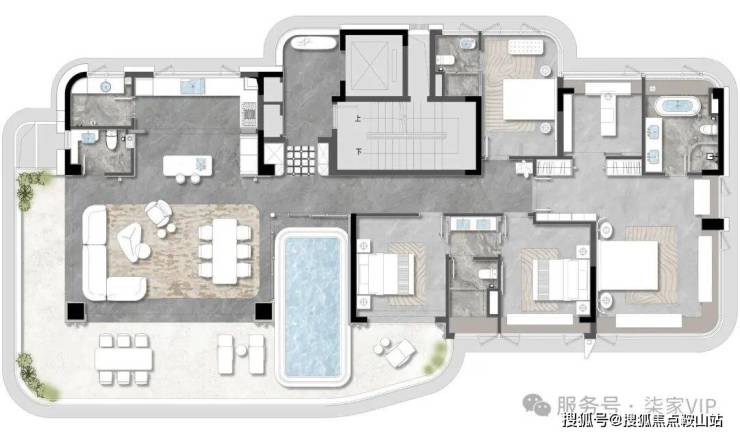邱德光设计岛心多维共享空间,如社区“灯塔”,以蔚蓝泳池为视觉心脏,用拱廊构建地中海式或南洋风情社交氛围,涵盖恒温泳池、宴会厅、雪茄室、瑜伽室、咖啡厅、茶室等塔尖社交场域。