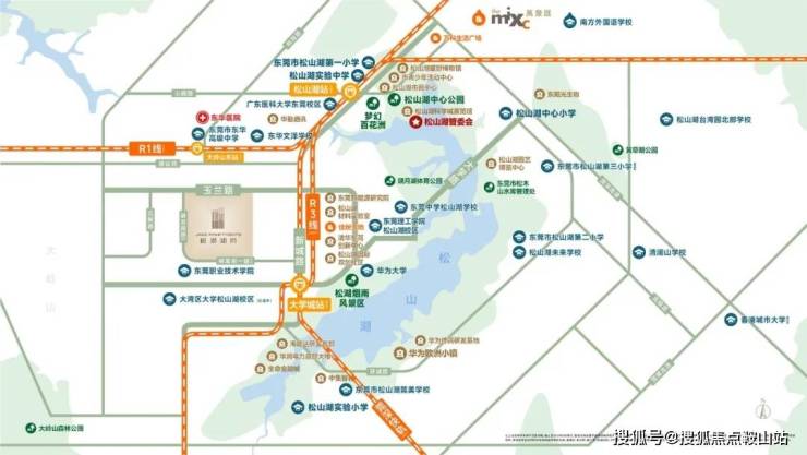 松山湖中部,三甲医院、世界级大学、众多科创机构和高新技术企业林立,乃松山湖宜居+科创的代表,板块价值位处松山湖塔尖。
