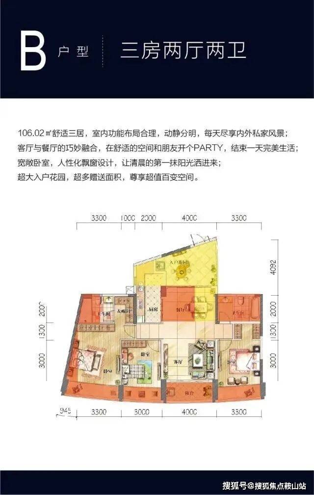 106.02㎡宽敞三居,室内功能区分明确,动静分明,每天独享内外私家风景。客厅与餐厅融汇相通,在舒适的空间内开个PARTY,尽显主人心境;宽奢卧室,人性化飘窗设计,让清晨的第一抹阳光洒进来;超大入户花园,超多赠送面积,尊享超值百变空间。
