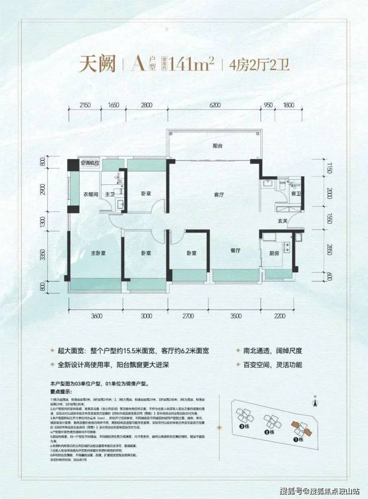 141㎡的4房2厅2卫,设计的是横厅南北通透格局,进门入户玄关,超宽客厅6.2米的开间,五开间朝南,4个卧室分别做到了主卧19.62㎡/次卧12.45㎡/次卧10.36㎡/次卧9.04㎡(包含墙体飘窗),主卧大套房设计,U型厨房,公卫三段式分离设计,得房率约:81.4%(不含赠送),阳台主朝东北向,看科学公园景观。