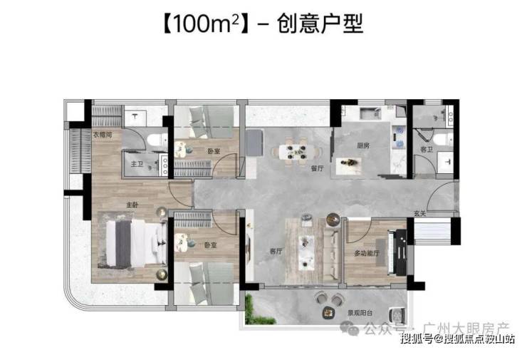 【100㎡四房两厅两卫】:西南向,使用率109%,南北通透,约6.1米巨幕阳台,主卧270°主卧弧形玻璃幕窗。