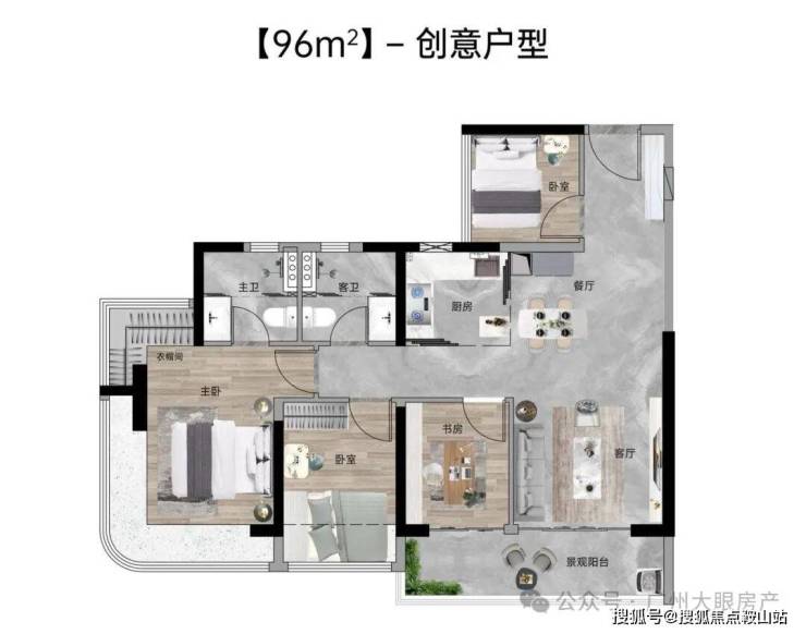 【96㎡四房两厅两卫】:西南向,使用率100%,约5.7米面宽瞰山阳台,主卧270°主卧弧形玻璃幕窗。