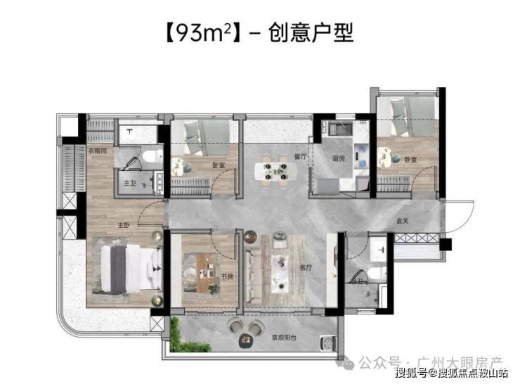 【93㎡四房两厅两卫】:东南向,使用率109%,独立入户玄关,南北通透,四面宽极致视野,主卧270°主卧弧形玻璃幕窗。