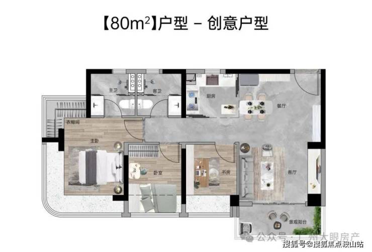【80㎡三房2厅2卫】:东南向,使用率107%,四开间南向,12.6米超大面宽,主卧270°弧形玻璃幕窗。