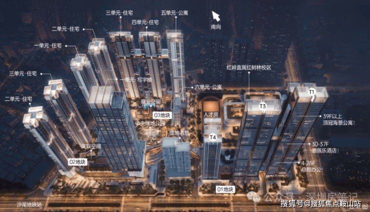 项目总占地约9.6万㎡,总建面约113万㎡,由四个地块组成,分为两期开发。01地块是写字楼+办公公寓+人才房+幼儿园;02地块是一栋写字楼+2栋住宅+8层商业体;03地块是4栋住宅+2栋公寓;04地块是在建中的红岭教育集团红树林校区。