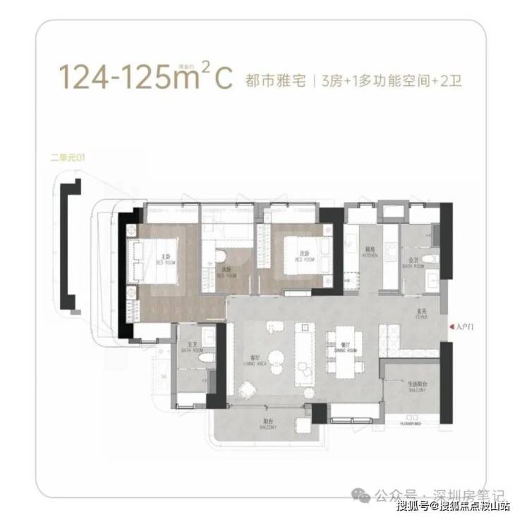 T6栋(三单元):总高58层,4梯6户,111-124㎡3-4房。