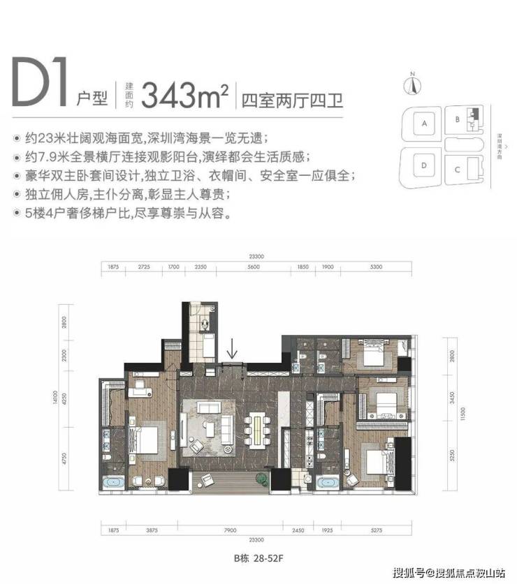 观景阳台:高区340平米户型,东面23米宽无敌海景视野(塔楼总观景面约46米)