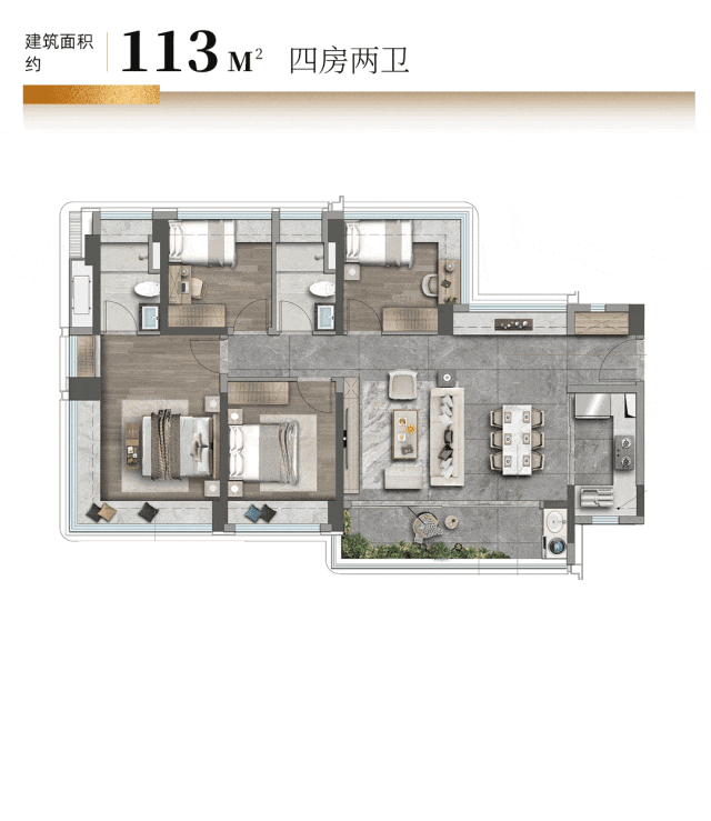 3个次卧既能满足多孩家庭需求,又能用作兴趣间、书房等,随家庭需求而变化,使用灵活。