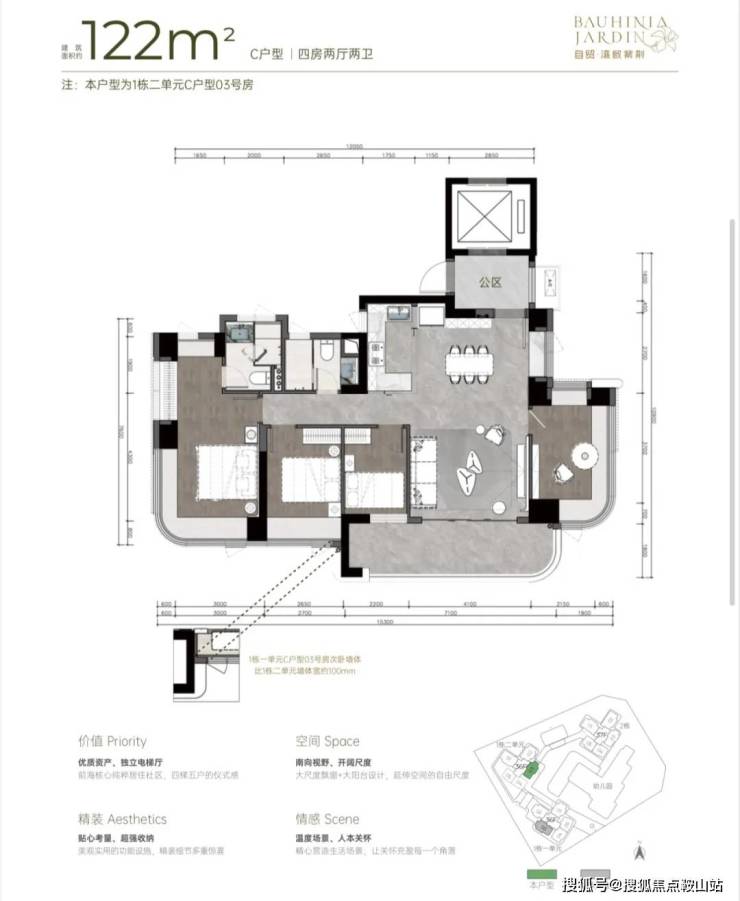湾啟紫荆位于前海妈湾听海大道,占地约1.5万㎡,住宅建面约6.6万㎡,容积率5.14,共有三栋住宅组成,层高36-37F,共485户,车位595个,车位比1.1.2,4梯5户,主推约96㎡稀缺三房、111㎡3+1房、122㎡四房、142㎡四房。户型设计了大客厅、宽景阳台、阔景飘窗等,拥有山海河多重景观资源,计划品质精装交付。户型采用建筑新规设计,户户大阳台,4梯5户,分布式电梯设计,独立电梯厅。