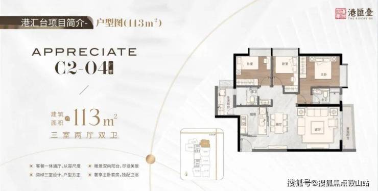 113㎡三房两厅两卫,阔绰三室设计,户型方正,釆光面广,瞰景双向阳台,尽览美景,奢享主卧套房,独配卫浴