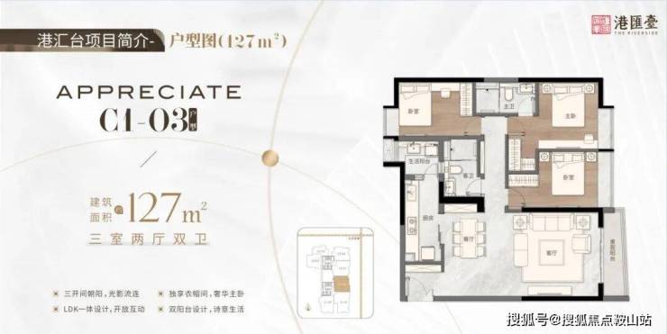 127㎡三房两厅两卫,三开间朝阳,釆光景观无遮挡,LDK一体设计,开放互动,大开间设计,释放更大的活动空调,双阳台设计,诗意生活