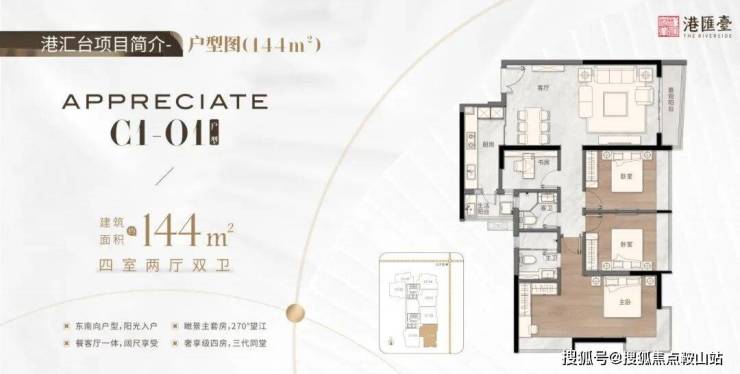 144㎡四房两厅二卫,东南向户型,阳光入户,瞰景主套房,270度望江,餐客厅一体,阔尺享受,奢享级四房,三代同堂