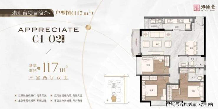 117㎡三房两厅两卫,阳台飘台视野广,无界风光,主卧奢配衣帽间,私藏优雅双阳台向阳,美景釆光入室,客卫三分离设计,井井有序