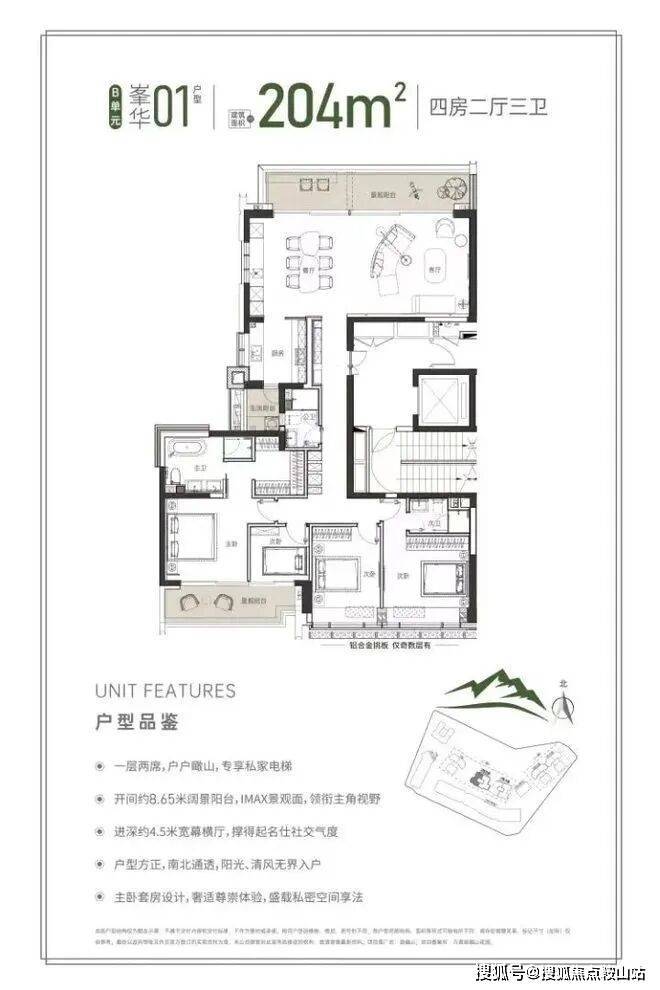 同样的专梯入户,豪宅感扑面而来,该户型为顶级大户型,四阳台设计,最大有10.55米的景观阳台和180度视野的餐客厅空间奢阔气场尽显,罕见的南北瞰景四阳台设计,让家的每个角落都能欣赏美丽的山景和城市景观。所有的开窗面都尽可能放大,客餐厅、书房、卧室、几乎都能享受超宽超大屏