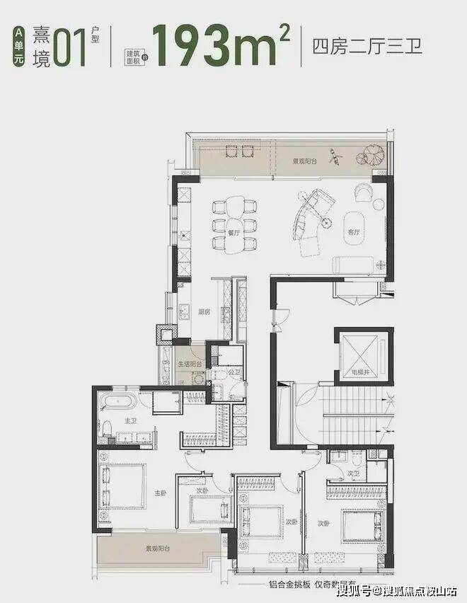 “双龙抱珠”设计的居住格局,中庭为厅,主客卧分布于客厅两侧,在提高空间利用率的同时,也能显著提高居住的私密性;主卧套房设计,带观景浴室