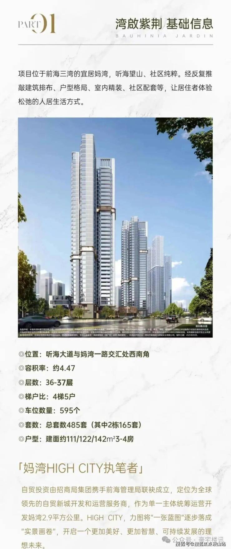 湾啟紫荆位于前海妈湾听海大道,占地约1.5万㎡,住宅建面约6.6万㎡,容积率5.14,共有三栋住宅组成,层高36-37F,共485户,车位595个,车位比1.1.2,4梯5户,主推约96㎡稀缺三房、111㎡3+1房、122㎡四房、142㎡四房。户型设计了大客厅、宽景阳台、阔景飘窗等,拥有山海河多重景观资源,计划品质精装交付。户型采用建筑新规设计,户户大阳台,4梯5户,分布式电梯设计,独立电梯厅。