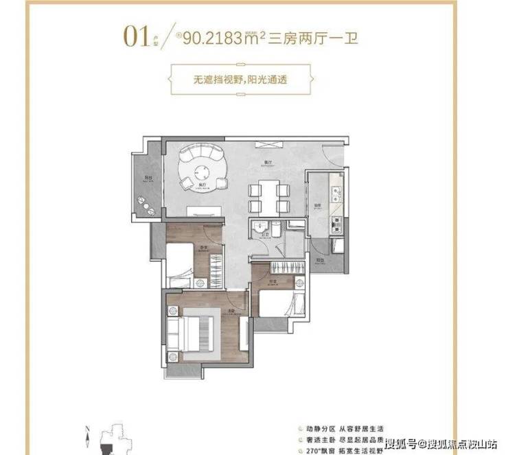 三口之家可以看看 90㎡的 3 室 2 厅,总价约 328 万元,布局很规整,厨房是 U 型设计,预留了冰箱位置,次卧面积刚好能放下儿童床,公卫做了干湿分离,日常使用互不干扰。