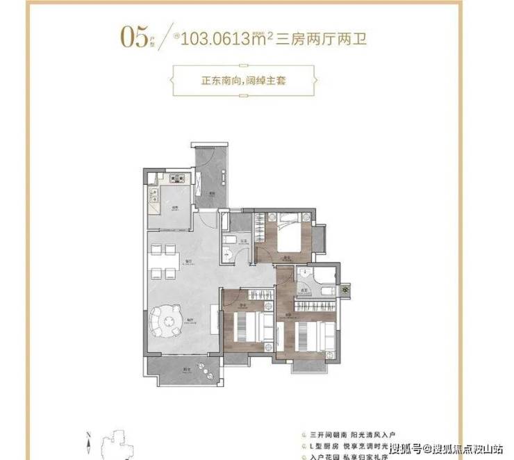 最大的在售户型是 103㎡的 3 室 2 厅,总价在 336 万到 450 万元之间,不同楼层和朝向价格差异较大,这个户型的客厅面宽更宽,阳台也更大,部分房源能看到远处的街景,适合有老人同住的家庭。