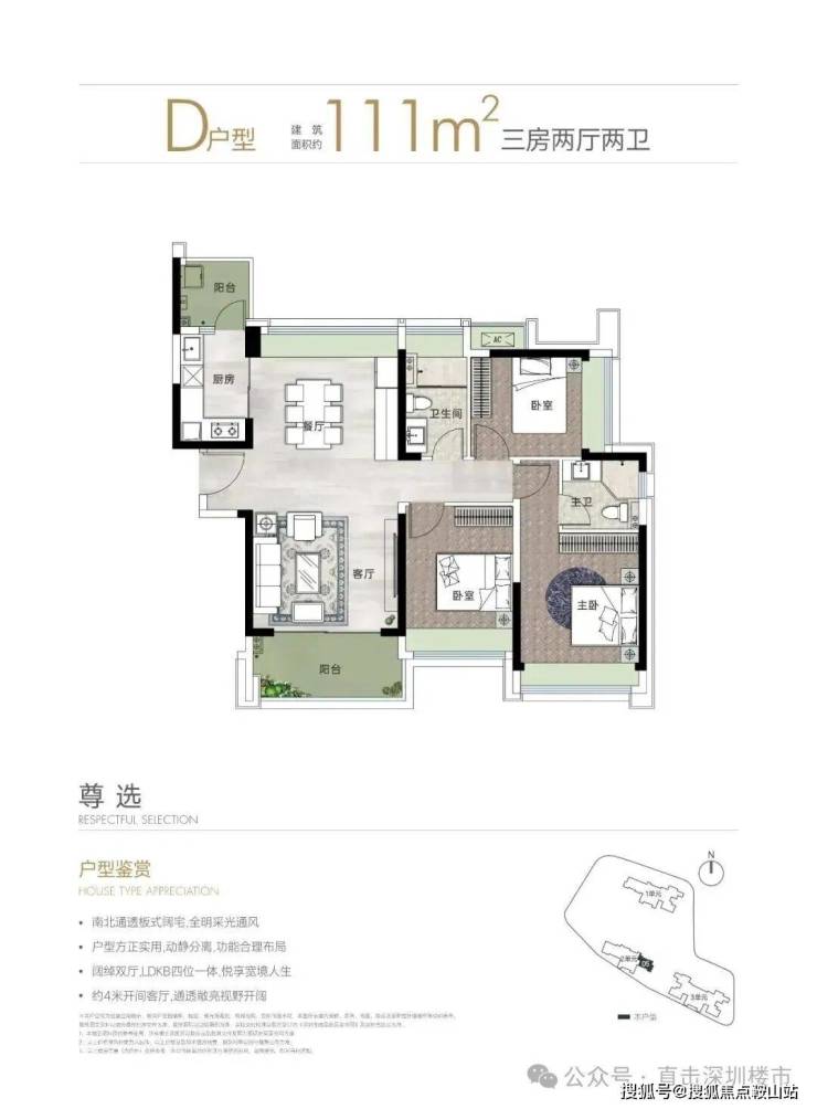 111㎡的3房2厅2卫,仅1栋2单元D户型,设计的是竖厅南北通透格局,板楼设计,客厅4米开间,LDKB一体化设计,三开间朝南,3个卧室分别做到了主卧13.88㎡/次卧11.1㎡/次卧9.99㎡(包含墙体飘窗),L型厨房还带1个小生活阳台,卫生间干湿分离,得房率约78.83%(不含赠送),西南朝向。