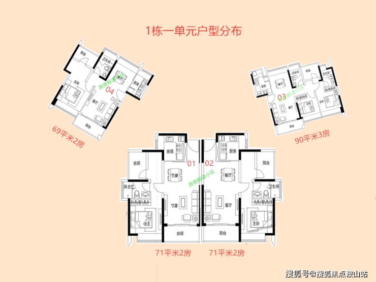 1栋1单元总层高31层,2梯4户型。01-02户型是71平米2房,朝南,都是客厅出阳台。03户型是90平米南北3房2卫。04户型是69平米是南北通透2房,这种户型市面上可以说是非常稀缺的户型,很奢侈的设计。