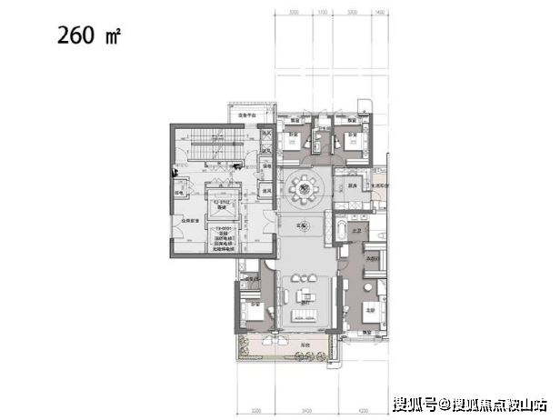 260㎡的四房位于3号楼的中间位置,3号楼采用四梯(含货梯)四户,每两户共用两梯。建面约260㎡的户型亮点:独梯入户对景玄关、经典竖厅户型、少过道、高使用率、超尺度景观阳台等,经济改善型首选。
