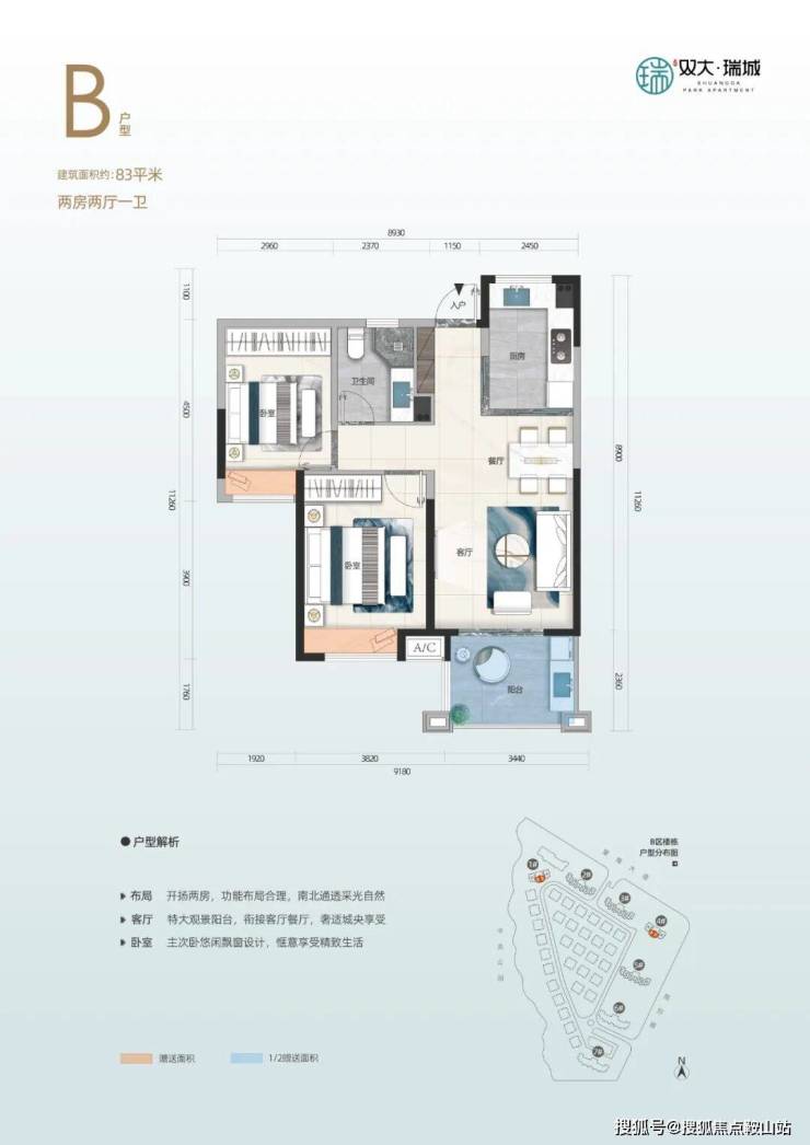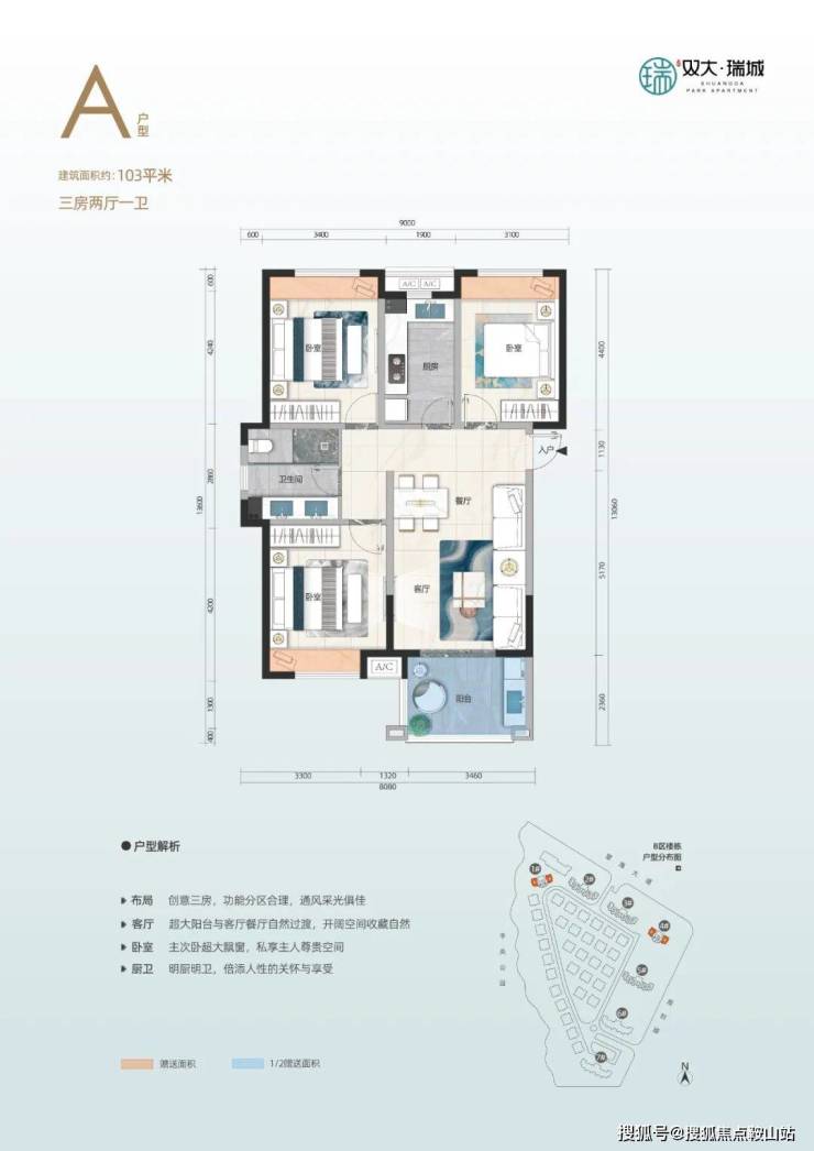 目前双大瑞城B区在售户型为103㎡三房和83㎡两房。