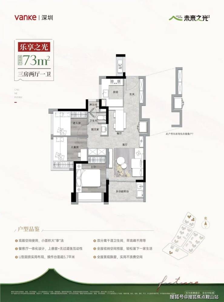 建面约73㎡(三房两厅一卫):高能空间使用,餐客厅一体,U型厨房设计实用布局,全屋景观飘窗,实用不浪费空间。
