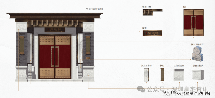 宅,以门户为冠带。无论是王室宫殿,还是世家府邸,门庭规制始终都渗透着礼序等级之道,代表威望所在。深圳院子的门头体系设计灵感来源于皇家王府官宅门头,礼序威仪,宏伟气派。一道门一重礼,用一院宅门威仪,传承着千年归家文明史。