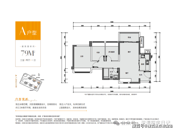 🏠79㎡的 3 房 2 厅 1 卫,设计的是竖厅南北通透格局,进门独立入户玄关,客厅 3.3 米开间,3 个卧室宽度分别为 2.9/2.25/2.25 米,得房率:88.49-90.18%(包含赠送),L 型厨房,阳台进深 1.5 米,主朝东北或西北向。