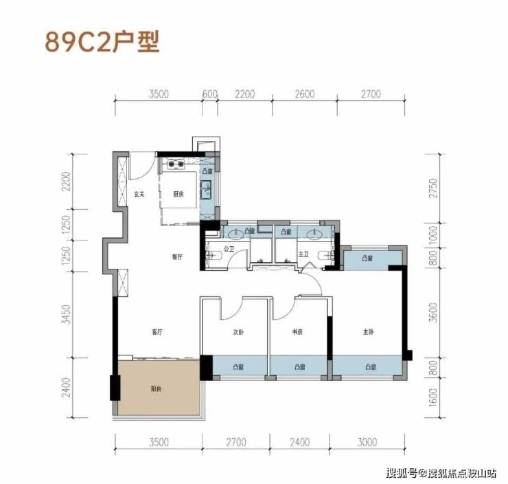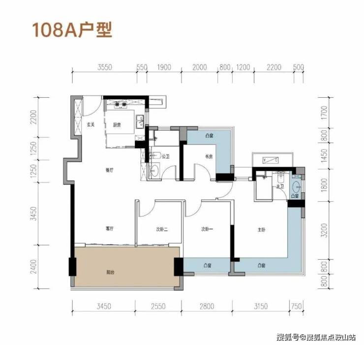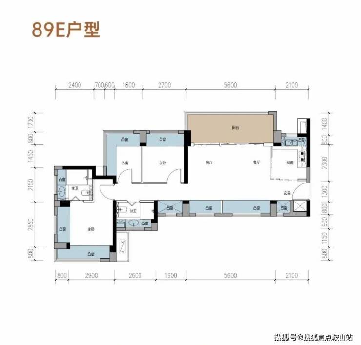 横厅南北通透设计,客餐厅 5.6 米开间,LDKB 一体化,11㎡大阳台,主卧 + 1 个次卧双飘窗,全屋 12 面飘窗,得房率约 96.4%(包含赠送),阳台主朝西北或东北向。