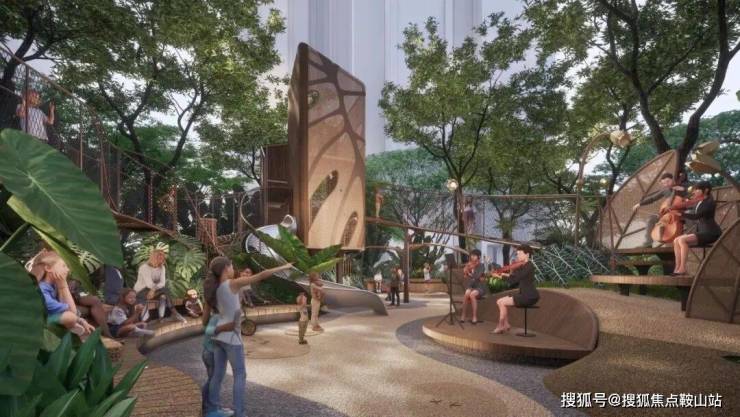 【达尔文营地游乐场】:约1500㎡规模,营地以大叶王国为主题,将生态教育、艺术文化结合成为自然探索乐园、游乐场为一体的多元活动场景。同时于6栋架空层相连,配置儿童自由玩耍的空间。