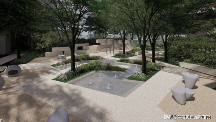 【自然水岸游泳池】:约400㎡无界亲子多元互动型泳池,与7栋架空层联动,在架空层内布置淋浴更衣、消毒池等功能,与周边绿化融合,无硬边界,绿植做隔断,旁边设置跌水景观。