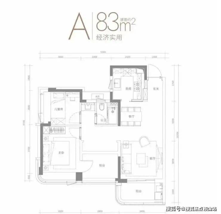 约98㎡户型,南北通透,南向采光面达到11.5米,除了承重墙部分外,都做成了阳台和飘窗,连两个卫生间都有一整面的飘窗,做到室内全明。主卧也是南北向布局,起居舒适度很好。