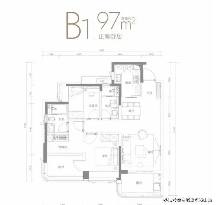 约97㎡户型,三面采光,南向采光面达到9.7米,次卧拥有L型飘窗,270°的采光面。主卧套房设计,带独立卫生间私密空间。
