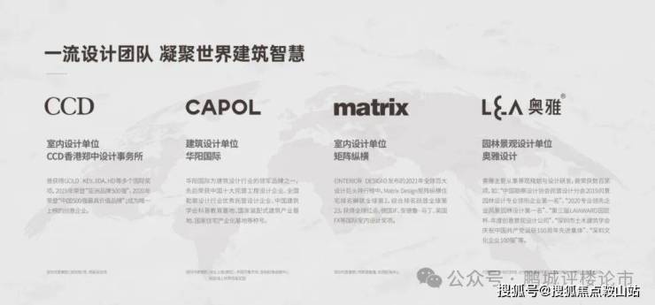 价值点4:集萃全球大师 联袂匠造标杆之作①建筑规划——华阳国际,其代表作包括深业上城、万象天地、海上世界双玺花园等。②室内设计——全球排名Top3高奢酒店设计公司 CCD 香港郑中设计事务所,及全球百大设计巨头矩阵纵横。