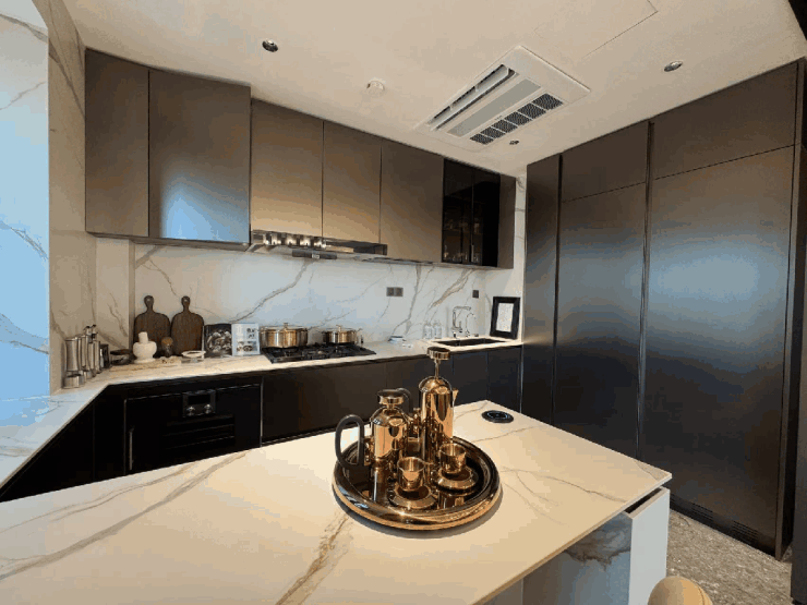 客餐厨部分,大理石背景墙和转角立柱皮革包裹也在交标中,细节处理比较到位。