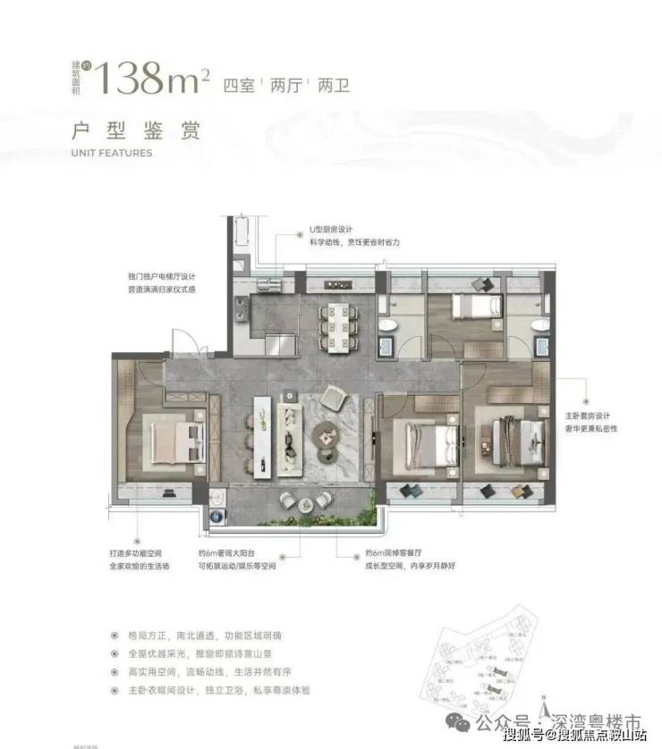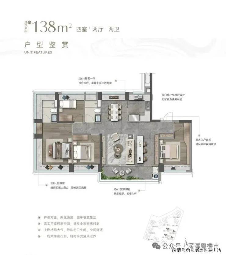 入户玄关巧妙隔绝视线,隐私感拉满。客餐厅南北通透,大客厅除传统布局外,还增设茶台区域,两者共享 6 米多宽景阳台,搭配 U 型厨房与方正餐厅,公区气场全开。