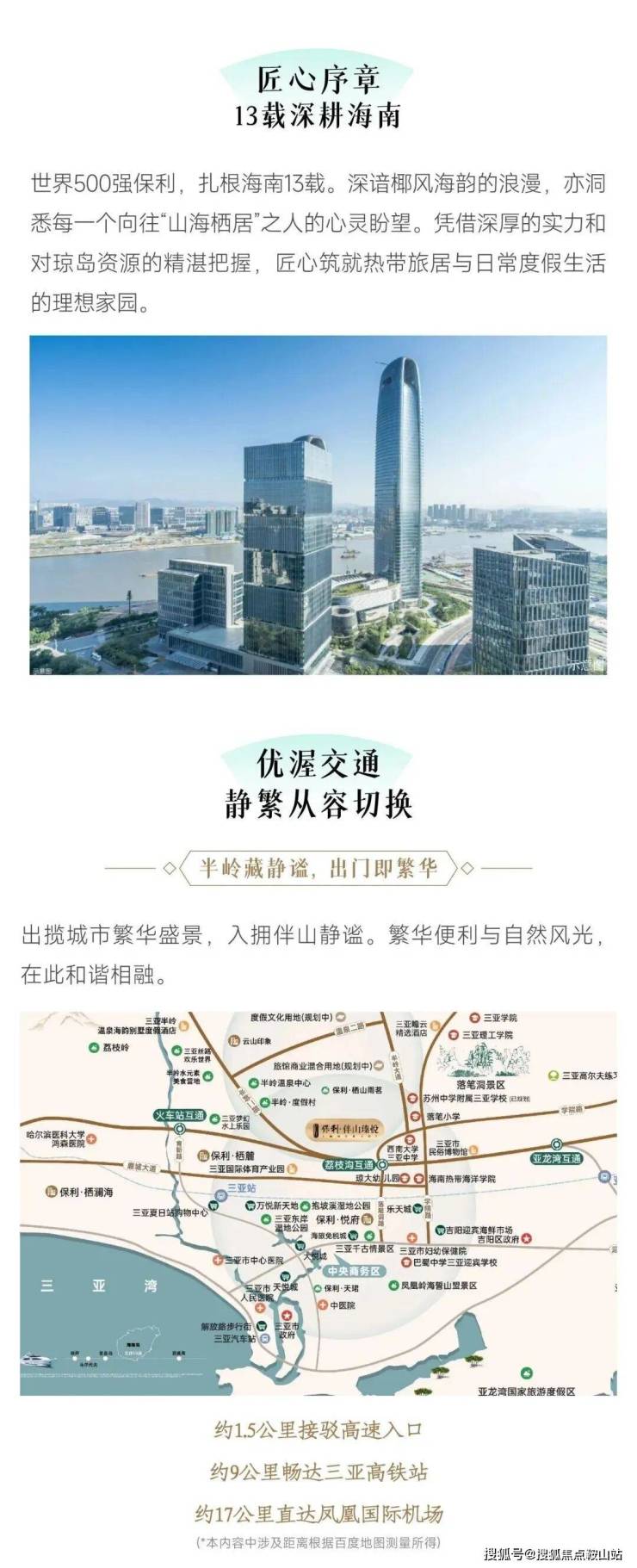 项目紧邻承载自贸创新、城市服务、政务服务和生态宜居为一体的抱坡新城三亚新中心,出则尽享城市便利交通及繁华配套、入则奢享人文山境风光,离尘不离城的度假胜境
