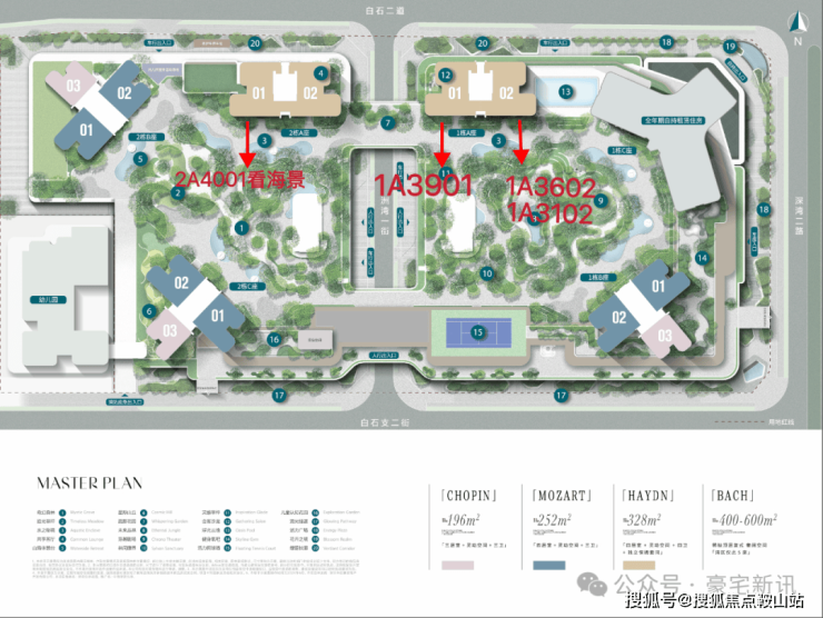 总楼层:1A栋41层;2A、2B、2C栋42层,1B栋59层,1C栋自持租赁54层,幼儿园4层。